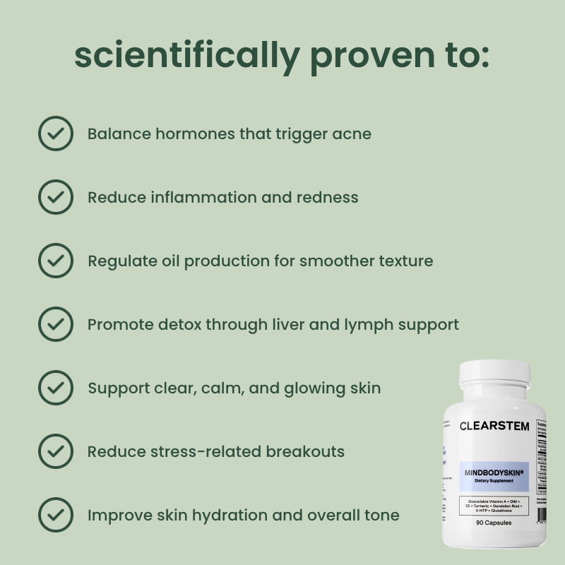Clearstem® restores internal harmony with hormone-balancing nutrients, liver-supporting antioxidants, and stress-relieving adaptogens — helping your body clear from within so your skin looks calmer, brighter, and beautifully balanced.